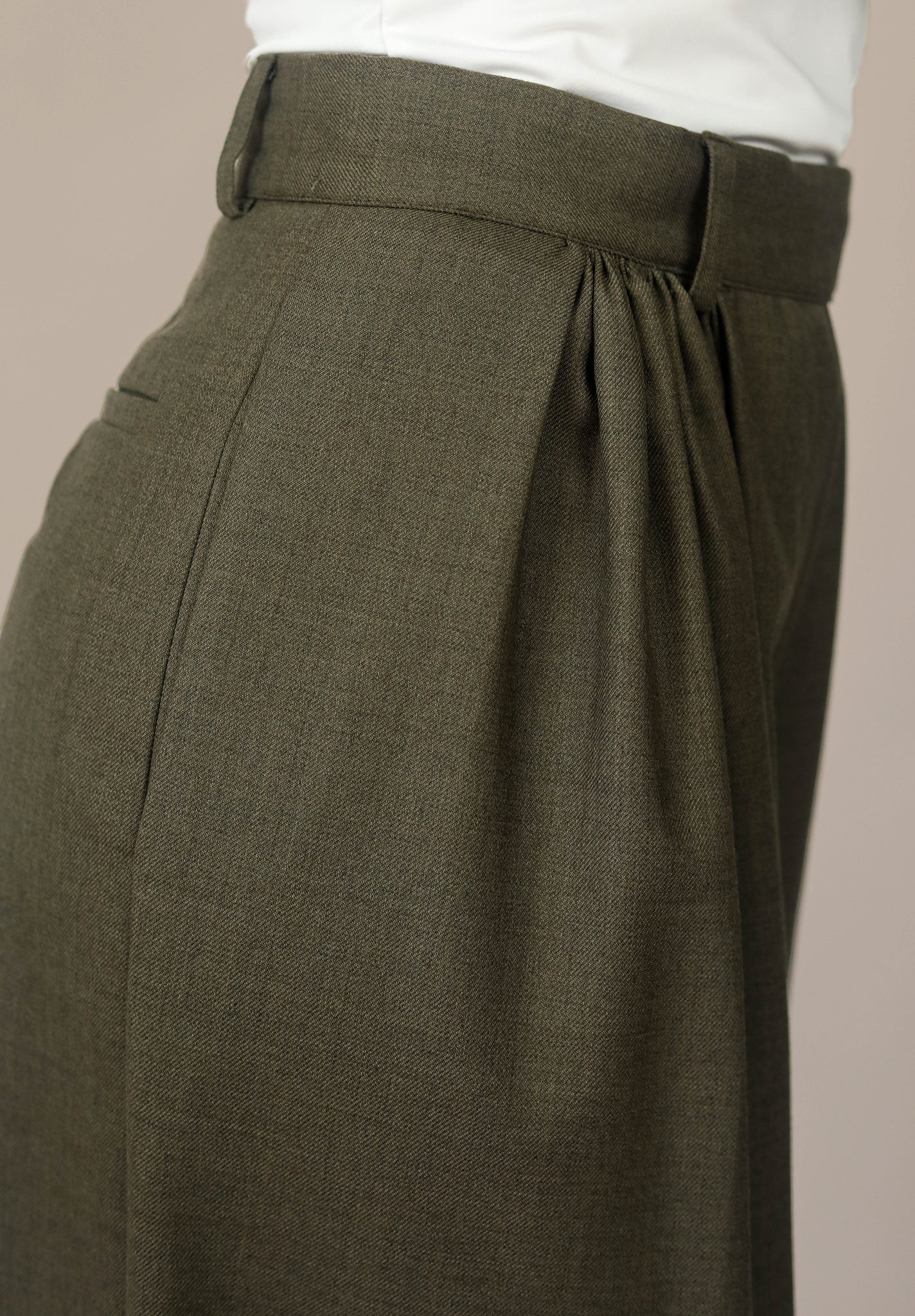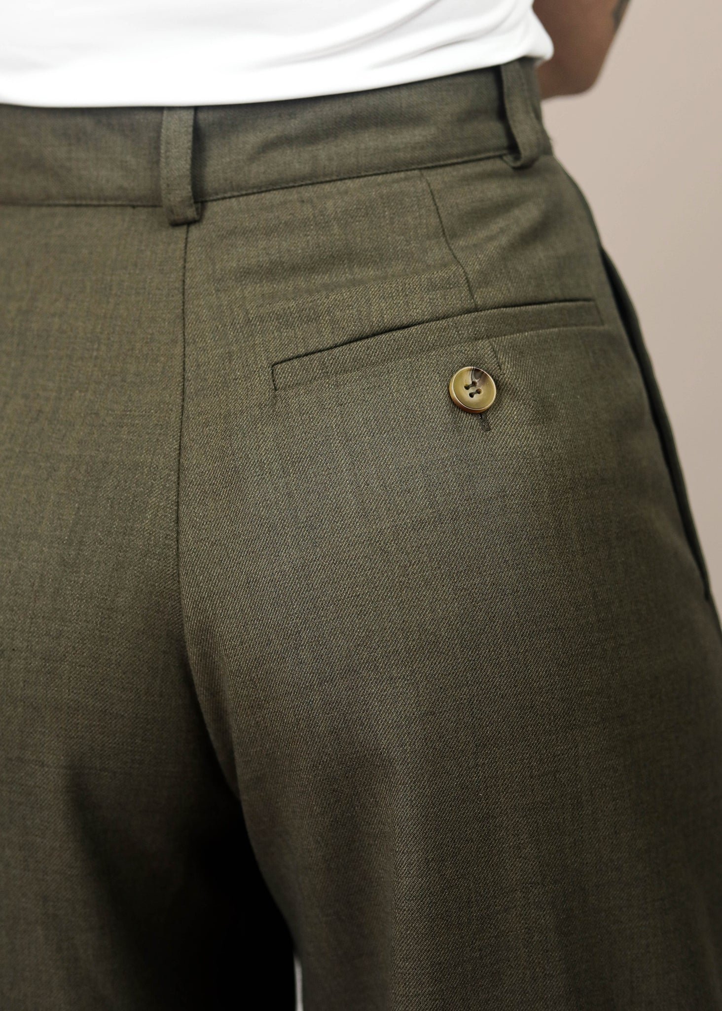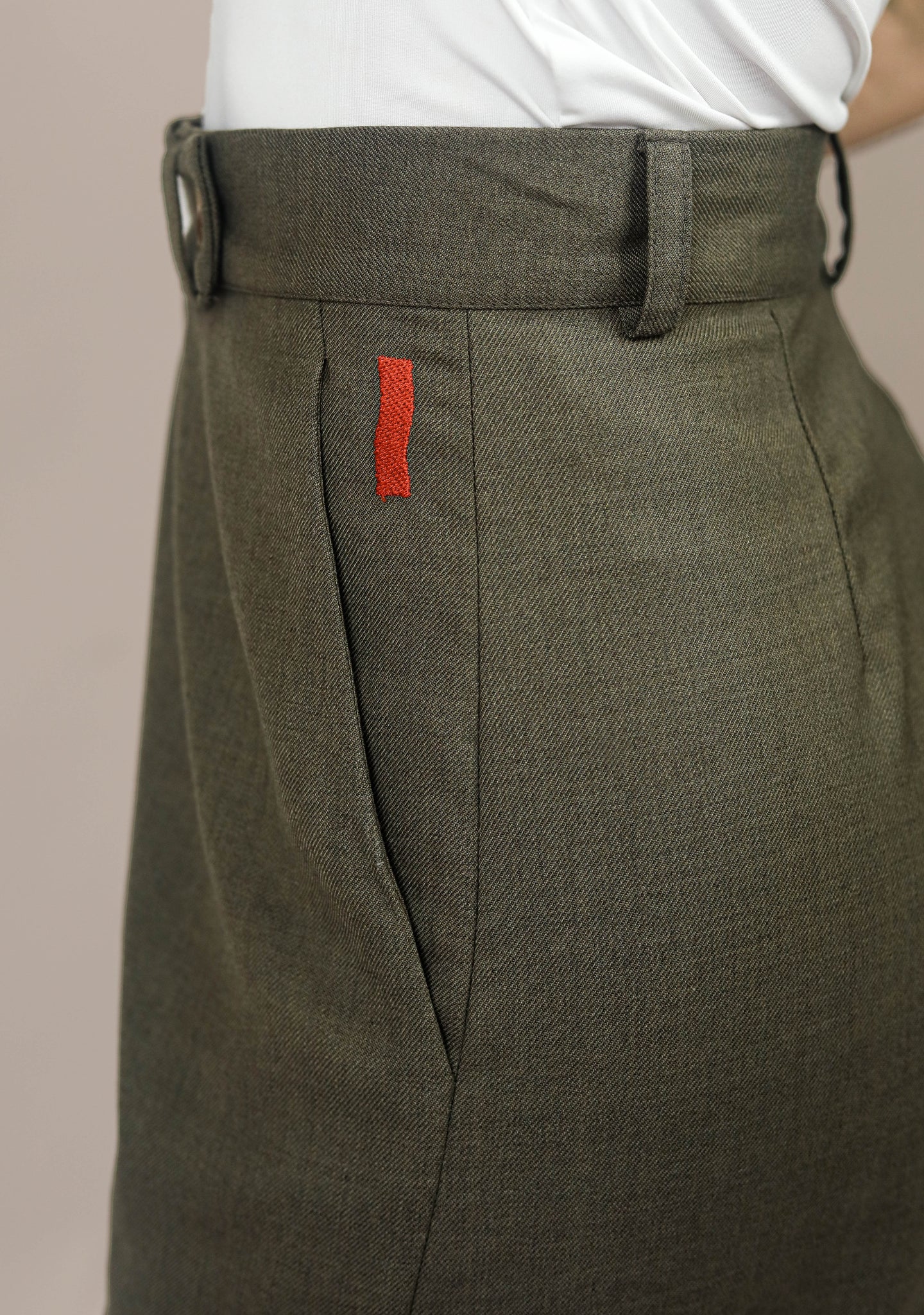 Tailored dlhé nohavice s vysokým pásom vynikajú čistou líniou a precíznymi detailmi. Predný diel je ozvláštnený jemným riasením na jednej strane, vďaka čomu je jedna nohavica mierne širšia a strih pôsobí originálne. Nohavice majú bočné klinové vrecká a zadné výpustkové vrecko s gombíkom. V páse sú osadené pútka na opasok, zapínanie je riešené vnútorným gombíkom a háčikom, pričom predĺžený pásec sa uzatvára samostatným gombíkom. Tento model spája eleganciu s pohodlným nosením a je ideálny do práce aj na voľný čas. Spolu s vestou VULCO tvoria jeden set.