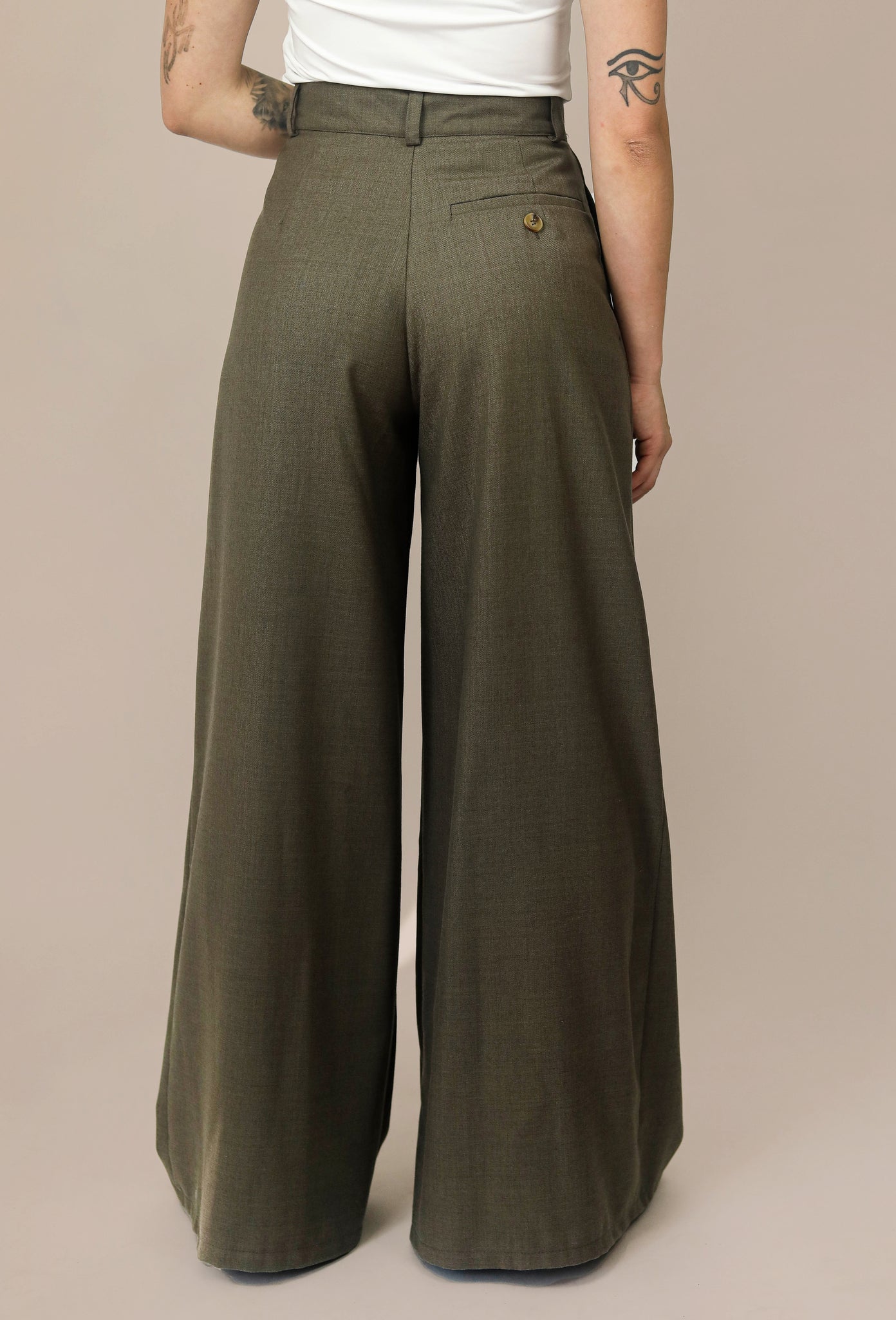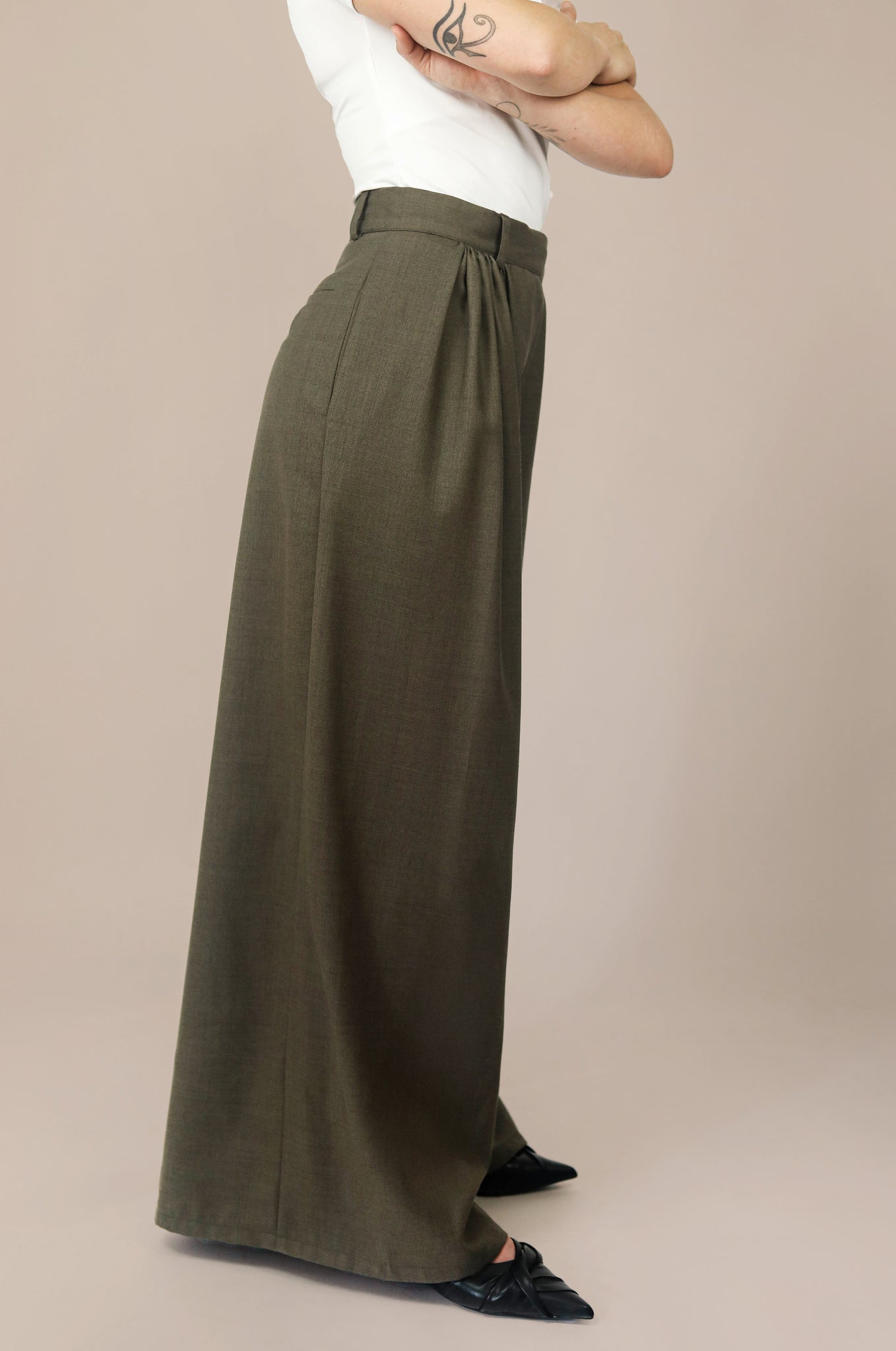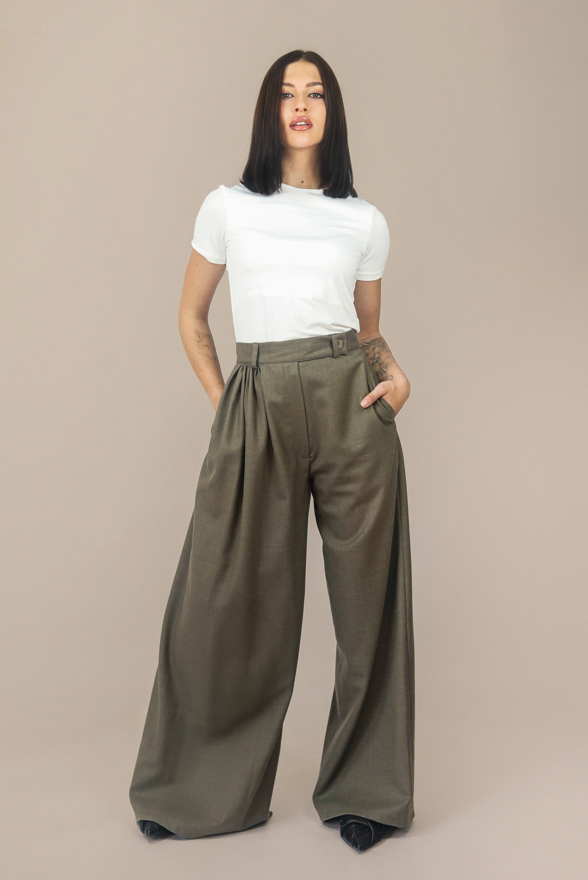 Tailored dlhé nohavice s vysokým pásom vynikajú čistou líniou a precíznymi detailmi. Predný diel je ozvláštnený jemným riasením na jednej strane, vďaka čomu je jedna nohavica mierne širšia a strih pôsobí originálne. Nohavice majú bočné klinové vrecká a zadné výpustkové vrecko s gombíkom. V páse sú osadené pútka na opasok, zapínanie je riešené vnútorným gombíkom a háčikom, pričom predĺžený pásec sa uzatvára samostatným gombíkom. Tento model spája eleganciu s pohodlným nosením a je ideálny do práce aj na voľný čas. Spolu s vestou VULCO tvoria jeden set.